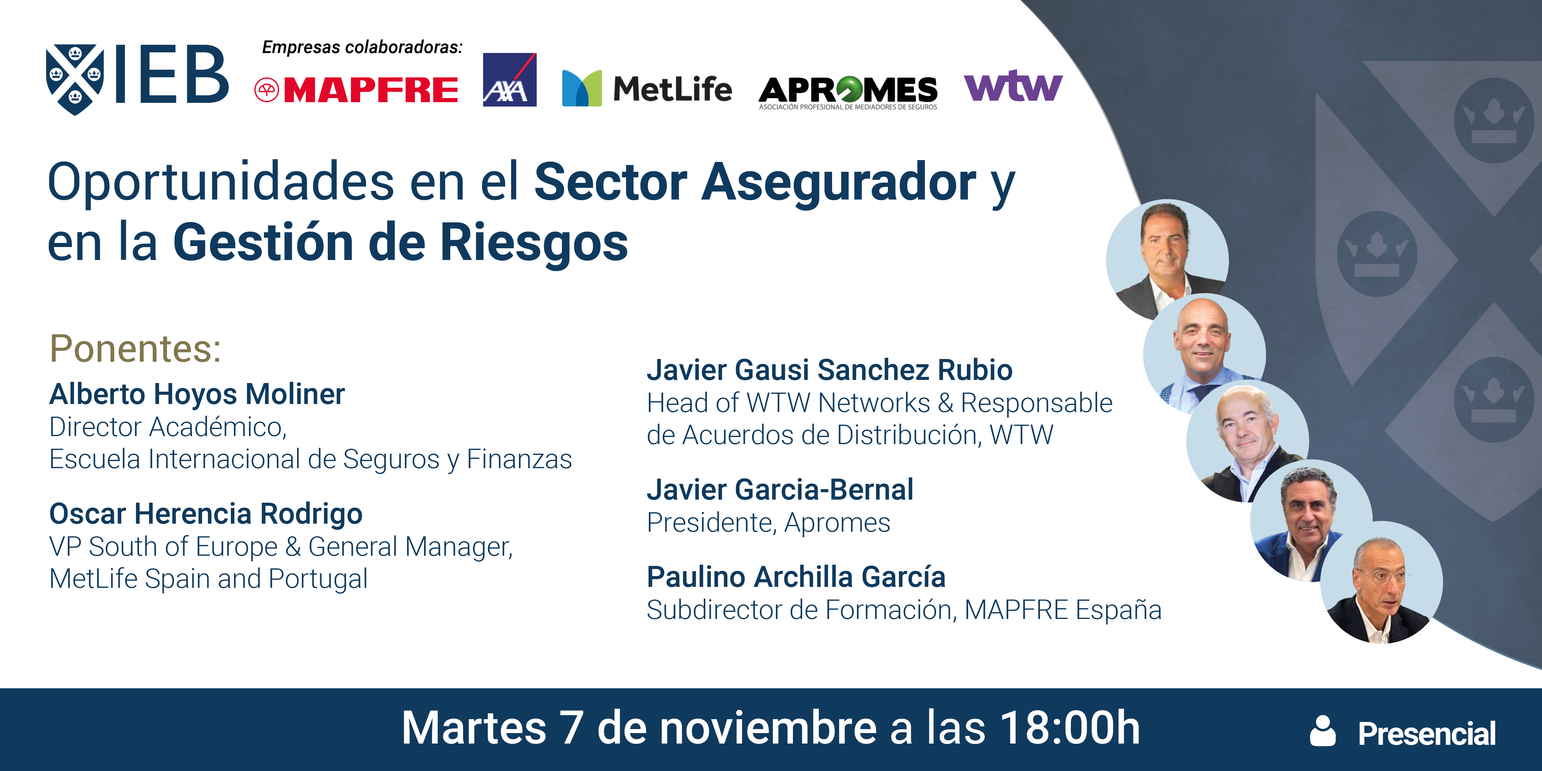 Oportunidades en el sector asegurador y en la gestión de riesgos Ponentes: Alberto Hoyos Moliner, Director Académico, Escuela Internacional de Seguros y Finanzas. Óscar Herencia Rodrigo, VP South of Europe & General Manager, MetLife Spain and Portugal. Javier Gausi Sánchez Rubio, Head of WTW Networks & Responsable de Acuerdos de Distribución, WTW. Javier García-Bernal, Presidente, [...]