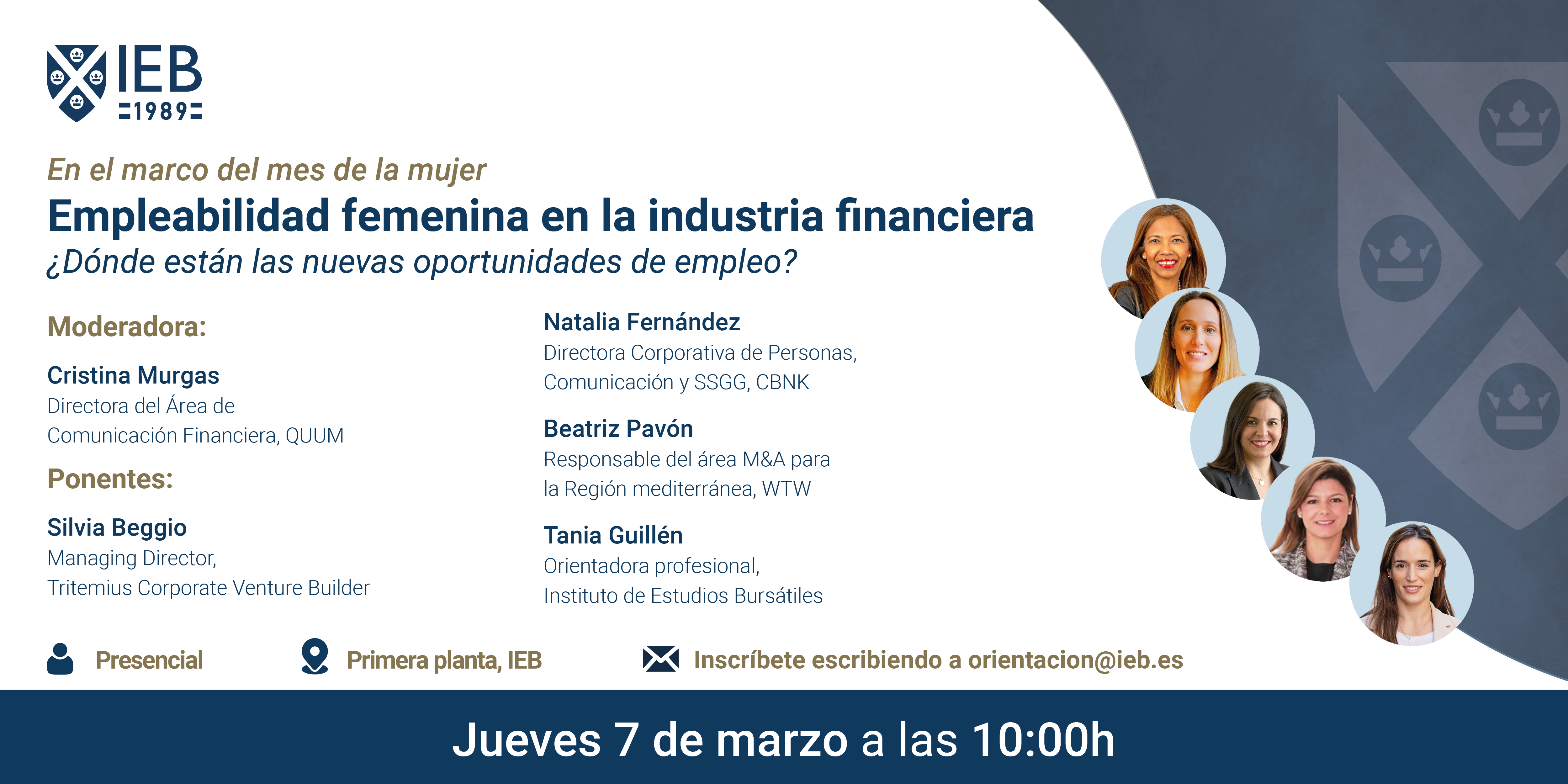 Empleabilidad en la industria financiera: ¿Dónde están las nuevas oportunidades de empleo? Ponente: Cristina Murgas, Directora del Área de Comunicación Financiera, Quum. Silvia Beggio, Managing Director, Tritemius Corporate Venture Builder. Natalia Fernández, Directora Corporativa de Personas, Comunicación y SSGG, CBNK. Beatriz Pavón, Responsable del área M&A para la Región mediterránea, WTW. Tania Guillén, Orientadora [...] |